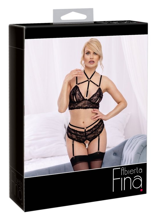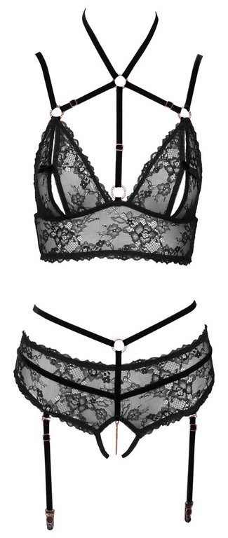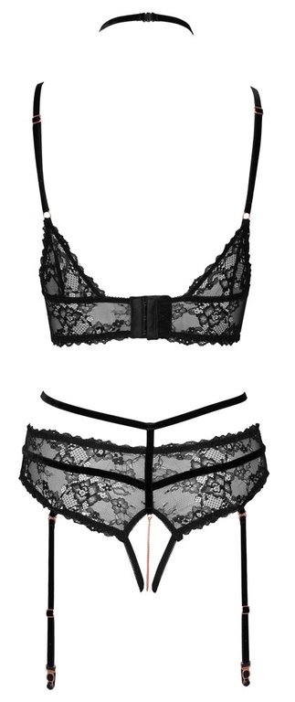Henkeäsalpaavan upea alusasusetti naiselle, joka ansaitsee vain parasta. Jännittävässä yläosassa on avattavat nännien paljastimet jäävät houkuttelevasti odottelemaan avaajaa ja tyylikäät kultayksityiskohdat lisäävät houkusta. Mielenkiintoiset olkaimet ja nauhat ovat hyvin säädettävissä. Alaosan alushousuissa kulkevat seksikkäät vyötärönauhat ja ne jättävät haaraosan kokonaan avoimeksi. Haaroissa kulkee stimuloiva ketju, jonka voit halutessasi irrottaa kokonaan.