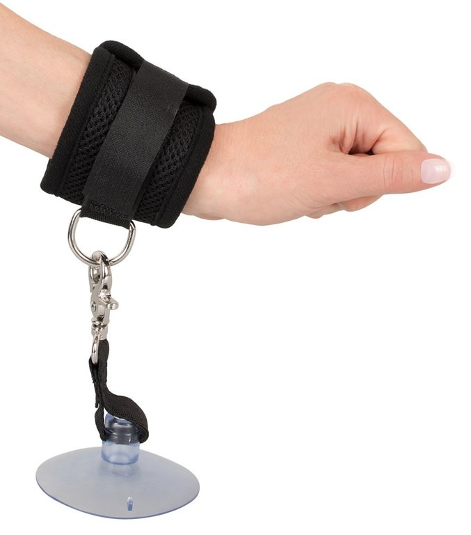 Käsikahleet imukupeilla. Kiinnitä kahleet ranteisiin ja sen jälkeen imukupilla vaikka kaakeliseinään. Imukupit ovat irrotettavissa kahleista. Pehmustetuissa kahleissa reilusti säätövaraa.