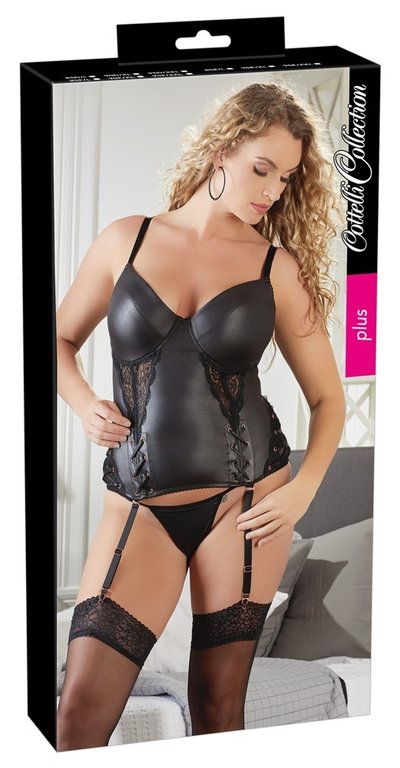 Erittäin miellyttävä päällä ja ennenkaikkea silmiähivelevän seksikäs alusasu! Mattamustaan alusasuun on yhdistetty runsaasti erilaisia yksityiskohtia, jotka tekevät siitä mielenkiintoisen. Löydät siitä erilaisia nyörityksiä. sekä läpikuultavaa pitsiä jotka luovat tästä ainutlaatuisen seksikkään alusvaatteen. Säädettävät olkaimet ja sukkanauhat takaavat istuvuuden. Takana hakaskiinnitys. Mukana yhteensopivat stringit. Materiaali 90% polyester, 10% spandex.