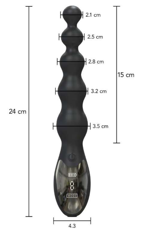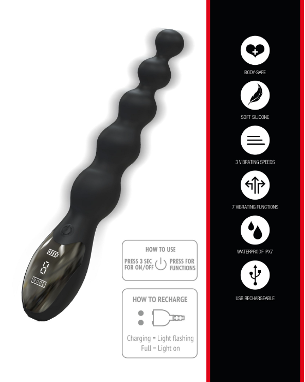 Mahtava upean muotoinen Anal Vibrator, 7 värinäohjelmalla ja 3 nopeudella! Tässä älyttömän kiihottavassa anaali vibraattorissa on 7 tehokasta värinäohjelmaa, jotka saavat sinut kiemurtelemaan nautinnosta. Puhumattakaan vibraattorin helmimäisestä muotoilusta, joka kruunaa kokemuksen! Käytä yksin tai yhdessä kumppanisi kanssa. Tuote on vedenkestävä, eli voit käyttää sitä vaikka kylvyssä.