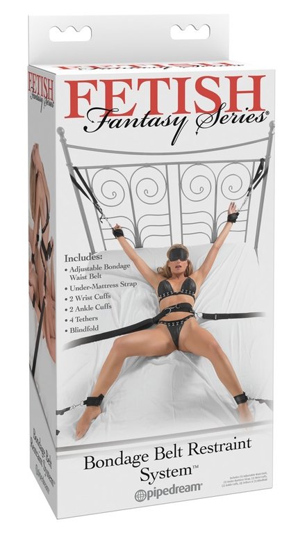 Patjahihna kulkee patjan alta ja kiinnitetään vyötärönauhaan. Käsi- ja nilkkakahleet kiinnitetään kiinnityshihnoihin pikalukon avulla. Kaikki osat ovat repäisynkestäviä ja säädettäviä! Unisex-malli!