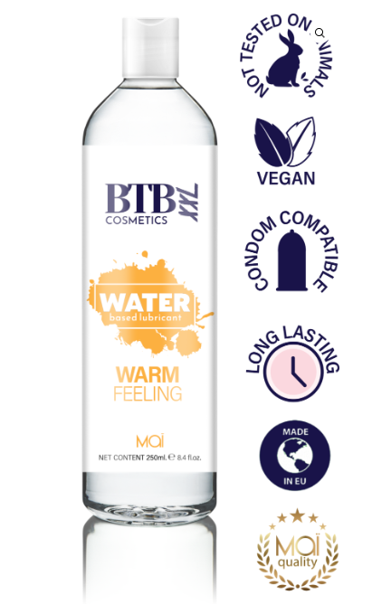 BTB Cosmetics Vegan Warm Feeling Liukuvoide on korkealaatuinen lämmittävä, joka on täysin vegaaninen eikä sitä olla testattu eläimillä. Tuote ei sisällä öljyjä eikä rasvoja vaan on täysin vesipohjainen. Likuvoide on kliinisesti ja dermatologisesti testattu ja se sopii erinomaisesti myös herkkäihoisille. Liukuvoiteen koostumus on pitkäkestoinen ja se ei tahmaa eikä tahraa.