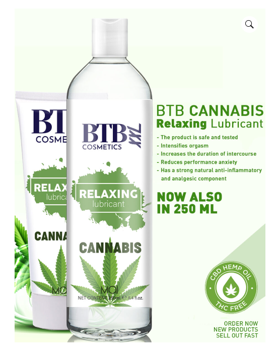 BTB Vegan Cannabis on täysin vegaaninen liukuvoide, joka lisää verenkiertoa intiimialuella ja voimistuttaa orgasmeja. Liukuvoide paransi tutkimuksissa seksuaalista suoriutumiskykyä noin 72-76% ja näin ollen se myös pidensi yhdynnän kestoa. Tuote sopii erinomaisesti herkkäihoisille. Sisältää CBD öljyä, jolla on tutkittuja terveydelle hyödyllisiä vaikutuksia. Tuote tuoksuu kannabikselta.