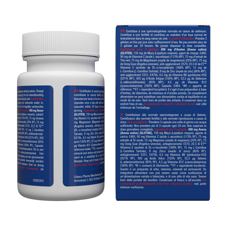 Kapselit, jotka säännöllisesti käytettynä parantavat sperman laatua ja lisäävät sen määrää. Kapseleiden sisältämä sinkki ylläpitää normaalia testosteronitasoa ja verenkiertoa. Sisältävät lisäksi mm. Seleeniä, E-vitamiinia, Macaa ja Don Quaita.