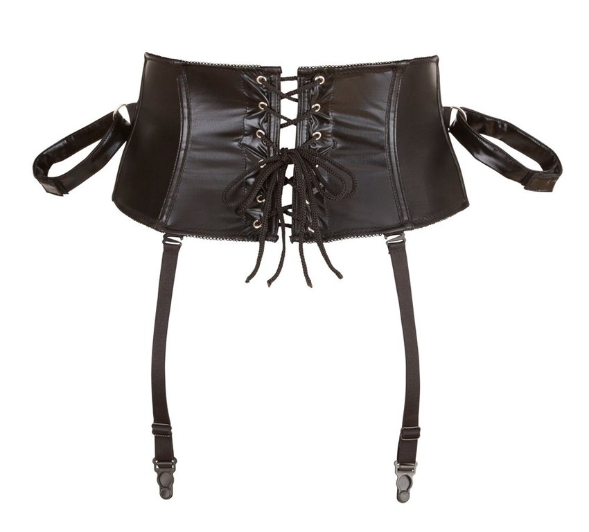 Bondagen ystävän ehdoton hankinta. Avokuppinen, tukeva korsetti muotoilevilla luilla. Edessä vetoketju ja nyöritys, takana vielä toinen nyöritys, joten istuvuus on taattu. Mukana myös kaksi käsikahletta, joissa kätevä tarrakiinnitys ja silmäside. Irrotettavat sukkanauhat. Materiaali 92% polyesteri, 8% elastaani.