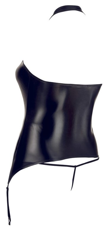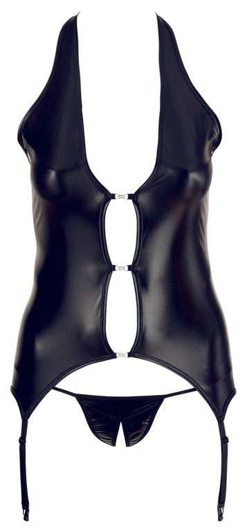 Upea himmeästi hohtava basque, runsaille muodoille. Neljä säädettävää sukkanauhaa, halterneck -pääntie, joka jättää selkäosan viettelevästi paljaaksi ja koko komeuden kruununa vastustamattomasti avoin etumus. Vain kolme strassikoristetta pitää asun ylläsi ja tottakai settiin kuuluu haarasta avoimet yhteensopivat stringit. Neljä kokoa, tilaa pian omasi ja pukeudu illan kuningattareksi. Mielitiettysi hullaantuu taatusti. Materiaali 92% polyester, 8% elastaani.