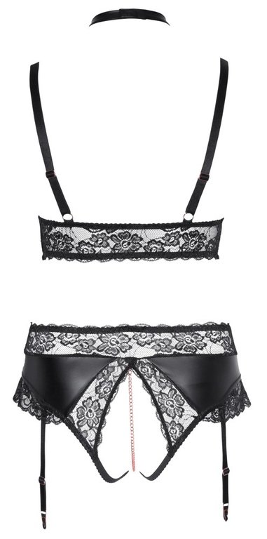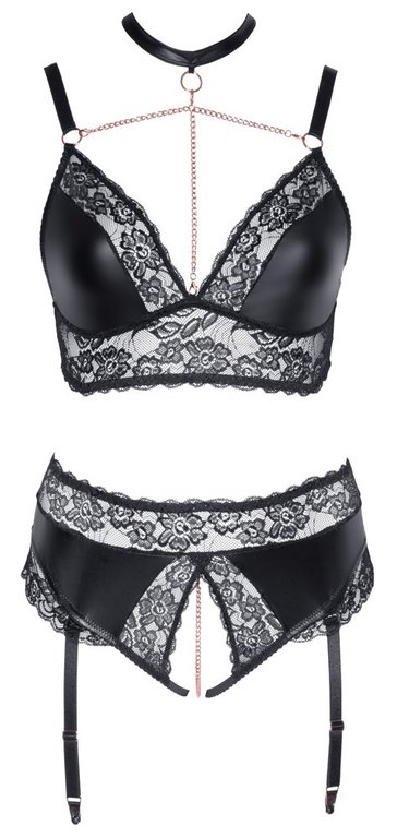 Superseksikäs BDSM-henkinen alusvaatesetti isommassa koossa! Tämä setti peittää täydellisesti ongelmakohdat, mikäli koet sellaisia omaavasi. Se korostaa juuri niitä seksikkäimpiä kurveja entisestää. Pue ja ole vastustamaton. Alushousut ovat avoimella haaralla. Säädettävät olkaimet ja sukkanauhat. Sukat eivät sisälly pakkaukseen.