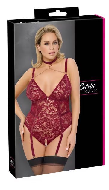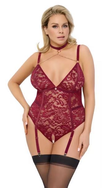 Loksauta leukoja tällä upealla punaisella pitsibodylla! Pitsi antaa asulle semi läpinäkyvyyttä, mutta ei paljasta kaikkea kerralla. Avoin haara taas toimii yhtenä seksikkäänä osana, tuomaan hieman omaa nautintoa, haaraan on myös lisätty ohut ketju. Muita seksikkäitä yksityiskohtia ovat upeat ruusukultaiset ketjut rintamuksessa jotka yhdistyvät kaulan ympärillä olevaan chokeriin. Asu todella tuo parhaat muotosi esiin sen muotoilulla. Asun roikkuviin nauhoihin voi kiinnittää stay-up sukat. Olkaimia on helppo säätää itselle sopivaksi!