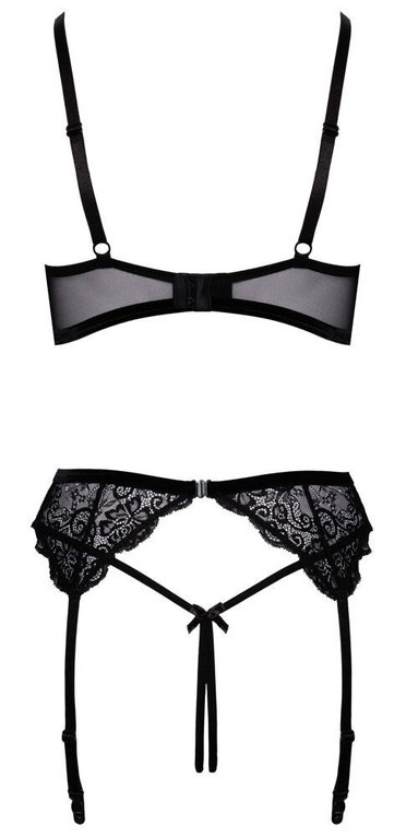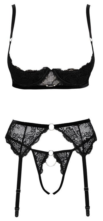 Pitsinen alusasusetti timanttikoristeilla. Tätä asua ei tarvitse riisua laisinkaan tunteiden kuumetessa, sillä se ei peitä rintoja tai haaraväliä. Avorintaliivit topatuilla kupeilla nostavat rintasi upeasti esille ja kohottavat niitä. Säädettävät olkaimet. Sukkanauhaliiveissä säädettävät nauhat, yhdistä niihin lempisukkasi! Avonaiset tangat näyttävät seksikkäiltä, mutta eivät peitä juuri mitään.