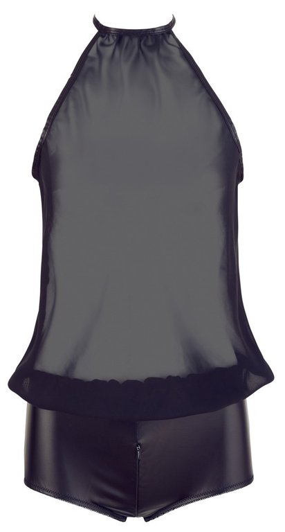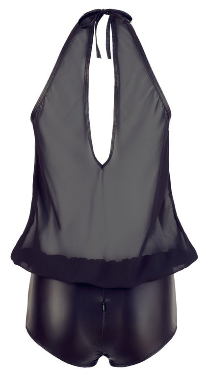 Tyylikkään väljä sifonkiyläosa, seksikkäällä halterneck-kauluksella, yhdistettynä napakasti istuvaan alaosaan. Haarassa kaksisuuntainen vetoketju helpottamassa ex tempore seksiä, tai ihan vain vessakäyntejä. Yläoas 100% polyesteria, alaosa 90% polyesteri, 10% elastaani. Neljä kokoa, valitse omasi.