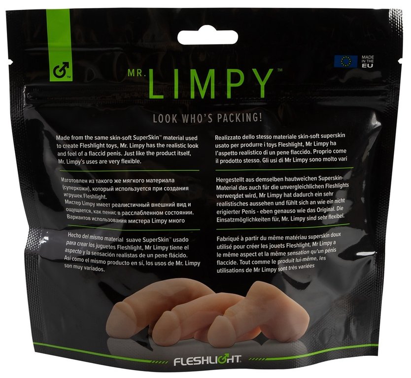 Mr. Limpy By Fleshlight on upeasti aitoa velttoa penistä jäljittelevä dildo. Mr. Limpy on erittäin joustava, joten voit käännellä sitä mihin asentoon tahansa. Dildo soveltuu erinomaisesti etumukseen tuomaan lisämuhkeutta. Materiaaliltaan se on laadukasta Fleshlightin Real Feel Superskin -keinoihoa.