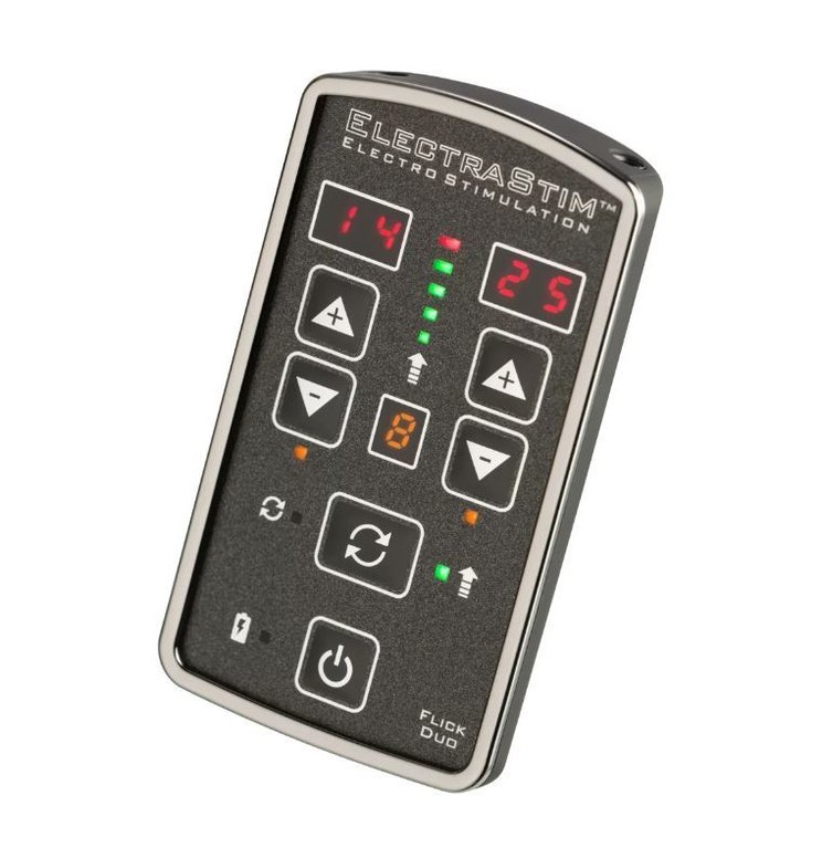 Ladattavalla akulla varustettu sähköstimulaatiolaite kahdella kanavalla. Kanavat ovat toisistaan riippumattomia ja niissä on 7 erilaista ohjelmaa ja jokaiselle vielä huikeat 24 eri nopeutta! Voit liittää laitteeseesi myös lisäosia ja saada erilaisia nautinnon tunteita. Mukana saapuu itse pääyksikkö ja siihen liitettävät 4 elektrodilätkää, 1 kpl elektrotappia, 2 penisrengasta ja sähköä johtavaa geeliä. Sopivat loistavasti intiimialueelle antamaan aivan uudenlaisia nautinnon tunteita. Näiden avulla voit saavuttaa syvemmän ja voimakkaamman orgasmin.