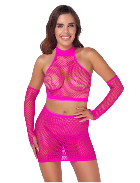 Bileisiin viimeistelemään asusi? Makuuhuoneeseen? Muuten vaan? Tämä upea räväkkään pinkki verkkoasusetti sopii minne vain! Yhdistä se lempi bile asujesi kanssa. Mukana tulee toppi, hanskat ja mekko. Verkko on joustavaa ja sopii S-L kokoisille. Joustavuuden ansiosta se mukautuu kehollesi hyvin.