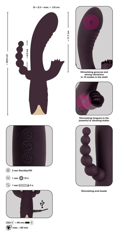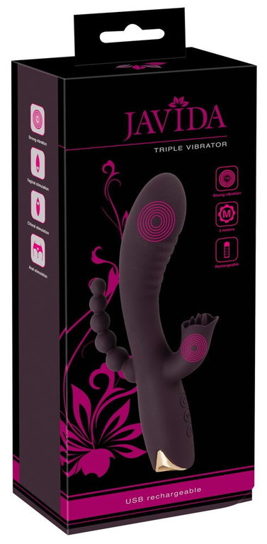 Kolminkertaista nautintoa voimakkaiden värinöiden kera! Javida Triple Vibrator hyväilee samanaikaisesti vaginaa, klitorista ja anusta. Kaksi voimakasta moottoria sijaitsevat sauvan kärjessä ja klitoriskiihottimessa. Niissä on kummassakin 10 värinäohjelmaa ja niihin 4 eri nopeutta. Taipuisat osat tekevät tästä vibraattorista vastustamattoman. Anushelmet stimuloivat samanaikaisesti kun g-pisteesi ja klitoriksesi saavat nautinnollista värinää. Orgasmisi eivät tämän voimakkaimmiksi mene.