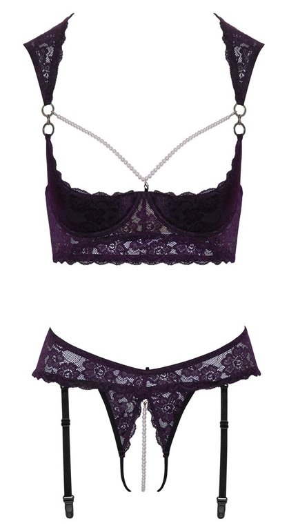 Upea avoalusasusetti ihanilla helmikoristeilla. Yläosan avorintaliivit jättävät rintasi houkuttelevasti näkyviin ja nostavat niitä ylöspäin. Sukkanauhaliiveissä yhteensä 6 säädettävää sukkanauhaa, joihin voit tukevasti yhdistää lempisukkasi. Avonaiset stringit ja niiden välissä kulkeva helminauha.