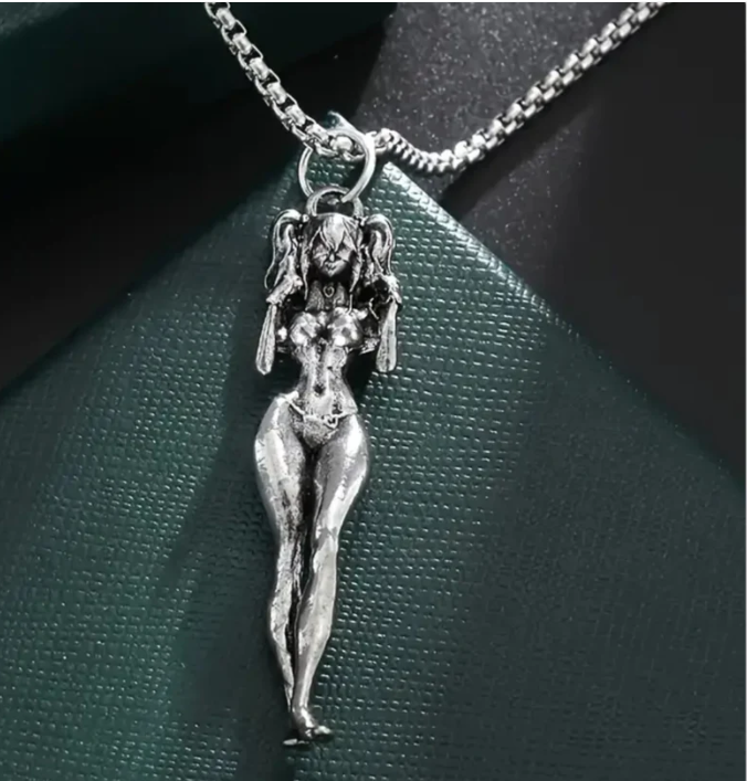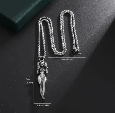 Kaulakoru Sexy Manga Girl on rohkea, provosoivasti muotoiltu kaulakoru, jonka suunnittelu on saanut inspiraationsa mangataiteesta ja jossa on seksikäs mangatyttöhahmo. Suunniteltu niille, jotka nauttivat uniikeista ja rohkeista asusteista. Korun pituus 6cm ja halkaisija 1,3cm. Ketjun pituus 60cm.