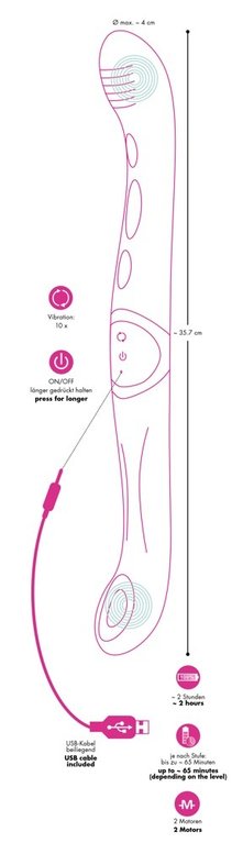 Nyt kivaa molemmille osapuolille samanaikaisesti tai sitten pelkästään sinulle. Tämän tupladildon molemmissa päissä on tehokkaat moottorit, joista löydät kokonaista 10 eri värinäohjelmaa. Lataat akun täyteen tehoonsa näppärästi mukana tulevan usb-laturin avulla. Tuotteen kaartuva kärki löytää helposti herkän g-pisteesi tai sopii myös miehen eturauhasen kiihottajaksi.