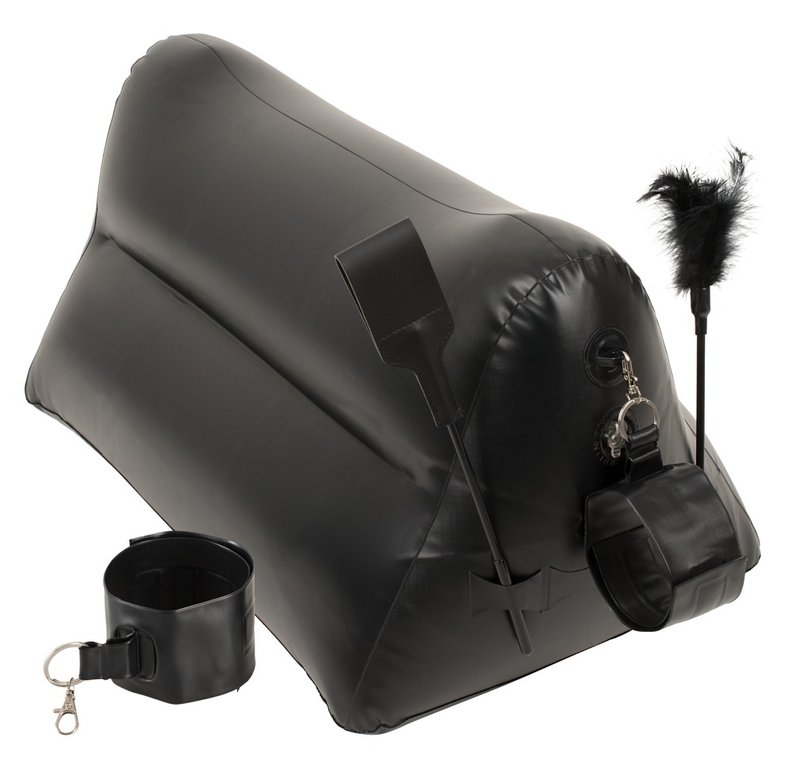 Puhallettava, kolmion mallinen rakastelutyyny kahleilla ja raipalla & kutitussulalla! Peppu pystyyn ja hauskanpito voi alkaa! Tyynyn avulla takaapäin-asennossa mies pääsee mahdollisimman syvälle naisen emättimeen, eikä naisen vartalo rasitu lainkaan! Mukana tulevat kahleet voi yhdistää tyynyyn tai käyttää erikseen. Materiaali PVC. Tyynyn mitat 60 x 36 x 36cm.