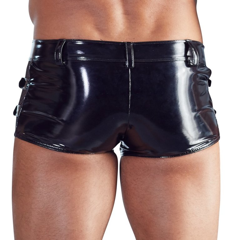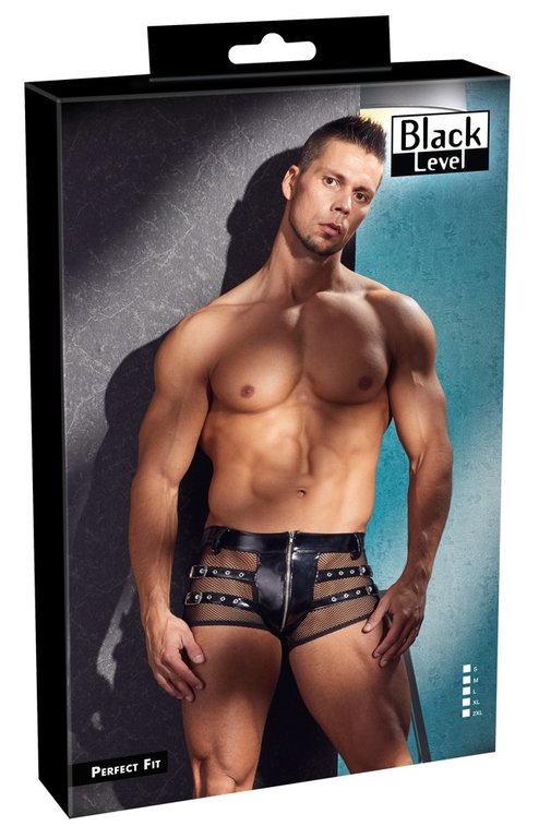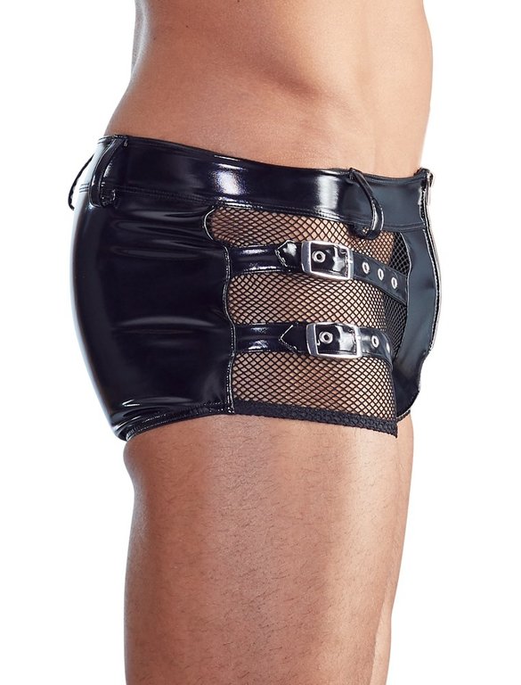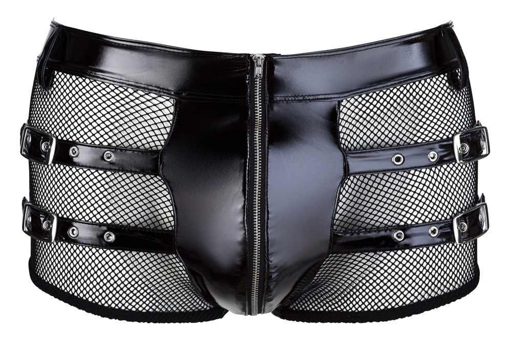 Näyttävät alushousut miehelle joka tietää mitä tahtoo. Verkkomateriaalin ja kiiltävän vinyylin yhdistelmä, viimeisteltynä näyttävillä remmeillä, tekee näistä housuista vastustamattomat. Materiaali 94% polyesteria, 6% elastaania.