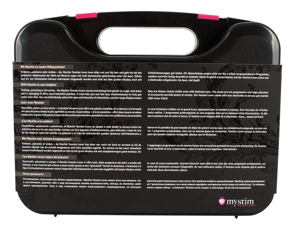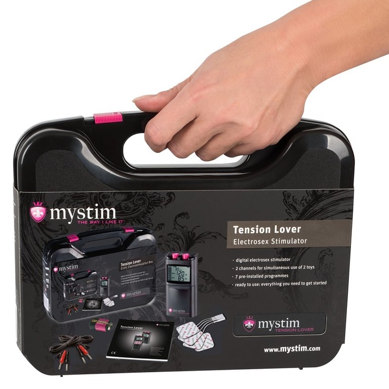 Virtalähde elektrostimulaatiotuotteille. Tension Loverissa on kaksi erikseen hallittavaa kanavaa, seitsemän nautinto-ohjelmaa (hellästä rajuun). Ajastin 10, 20, 30, 40, 50 ja 60 minuutille. Teho, taajuus ja impulssit ovat yksittäin säädeltävissa. Lukitustoiminto estää säädettyjen asetusten vahinkomuutokset. Suuri näyttö, kaapeliliitäntä liikkuu 360 astetta, estäen kaapeleiden murtumisen. Pakkaus sisältää kaiken mitä tarvitset sähköiseen nautintoon.