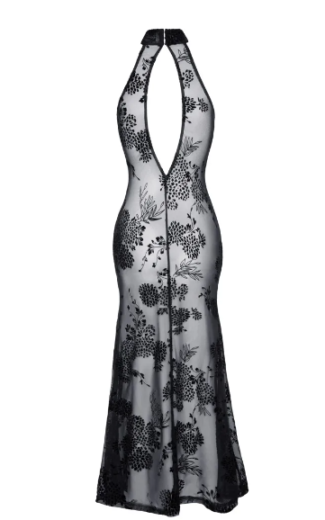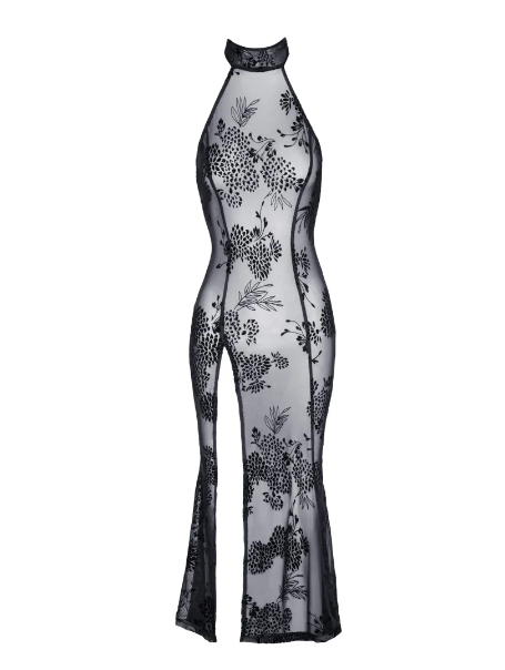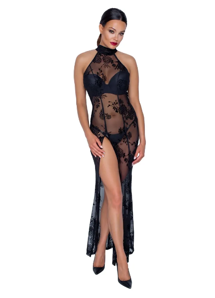Upea läpikuultava nillkoihin asti ulottuva mekko, jossa on erikoispitkä halkio edessä. Materiaali on joustavaa ja pehmeää parhaimman istuvuuden takaamiseksi. Upeana yksityiskohtana korkea kaulus ja kuvioidut samettiset yksityskohdat. Materiaalit 82% polyesteri ja 18% elastaani.