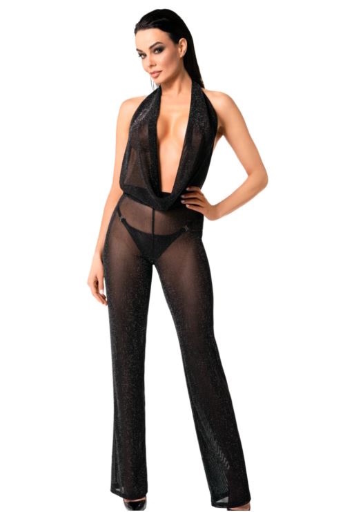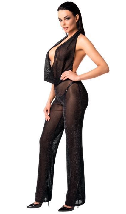 Kimaltavapintaisesta, kevyestä ja joustavasta kankaasta valmistettu upea jumpsuit. Erittäin matala pääntie tuo seksikkyyttä ja särmää. Hieman levenevät lahkeet.