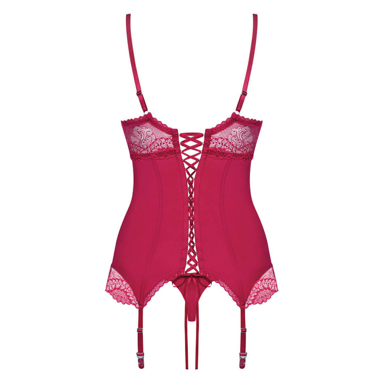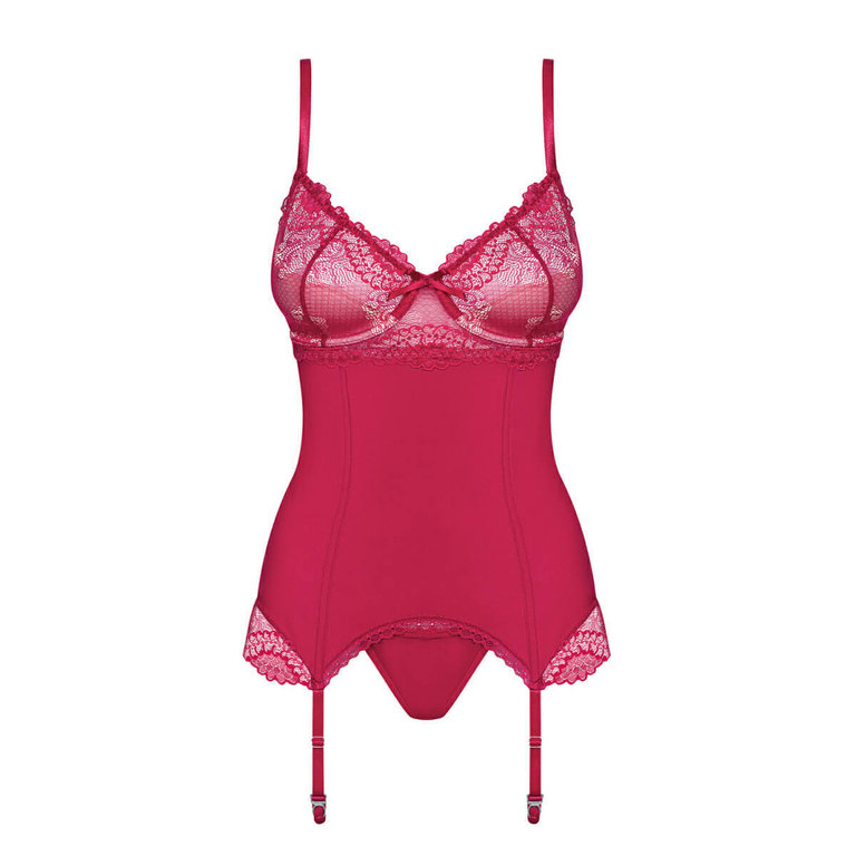 Sensuelli korsetti ja yhteensopivat tangat. Yläosan topatut kupit antavat sinulle ryhtiä ja itsevarmuutta. Säädettävät olkaimet takaavat sopivan istuvuuden. Korsetissa on mukana säädettävät sukkanauhat. Materiaali on sopivan joustavaa. Tee itsestäsi tulikuuma kaunotar tällä asukokonaisuudella.