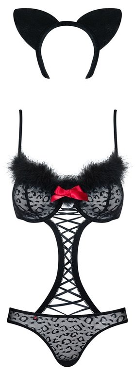Seksikäs ja söpö alusvaatesetti. Jos vähän mouruat tämä päällä, saat taatusti juuri sen mitä haluat! Edestä näyttää kuin ylläsi olisi yksi vaate, takaa taas kuin sinulla olisi yläosa ja alaosa erikseen. Mukana hiuspanta kissankorvilla. Miau! Valitse kokosi