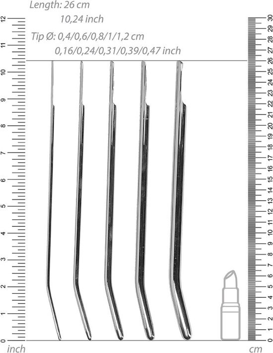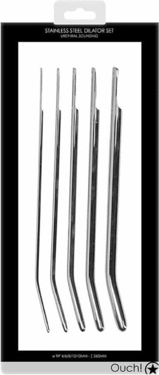 Ruostumattomasta teräksestä valmistettu dilaattorisetti kaartuvalla kärjellä. Setissä 5 dilaattoria, joiden avulla voit stimuloida virtsaputkea.