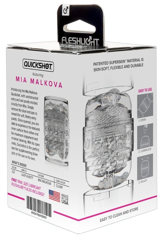 Fleshlight Quickshot tunnelin muotoilu on tehty kuuluisan aikusviihdetähden Mia Malkovan mukaan. Tuotteessa kaksi puolta: vagina ja anus. Tuote on valmistettu aidontuntuisesta keinoihomateriaalista ja sen sisällä on upeasti hierovia nystyröitä ja juomuja, jotka tuovat täydellistä nautintoa. Läpinäkyvyys antaa myös silmille uudenlaista ihailtavaa.