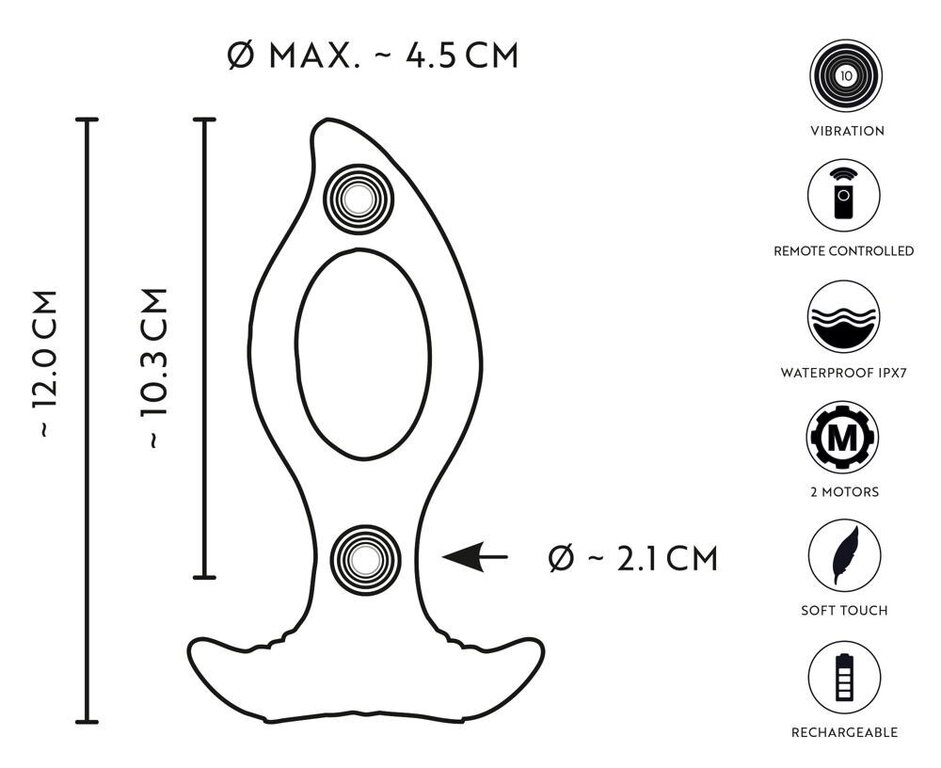 Värisevä anustappi innovatiivisella reiällä. Voit painaa keskeltä osat yhteen ennen sisäänviemistä ja ne aukeavat sisäpuolellasi tuoden ihanan venyvän tunteen. Kaksi moottoria tuovat roimasti lisästimulaatiota käytön aikana. Langaton ohjain on mukava lisä!