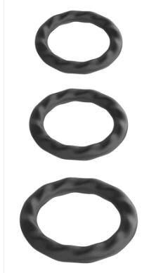 3 erikokoista, joustavaa erektiorengasta stimuloivalla tekstuurilla. Pinta on ihanasti muotoiltu. Renkaiden materiaali laadukasta silikonia. Renkaat voidaan asettaa peniksen varteen, kivesten ympärille tai sekä kivekset, että penis yhteen niputettuna. Sopii lähes kaikenkokoisille. Renkaat lisäävät mieskuntoa ja ylläpitävät erektiotasi.