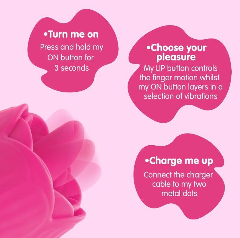Ruusunmuotoinen klitoriskiihotin 20 erilaisella ohjelmalla. Nauti sormettamisesta juuri silloin kun sitä kaipaat. Tuote on valmistettu silkkisen sileästä silikonista ja se on roisketiivis. Voit ladata akun täyteen tehoonsa mukana tulevan usb-laturin avulla nopeasti.