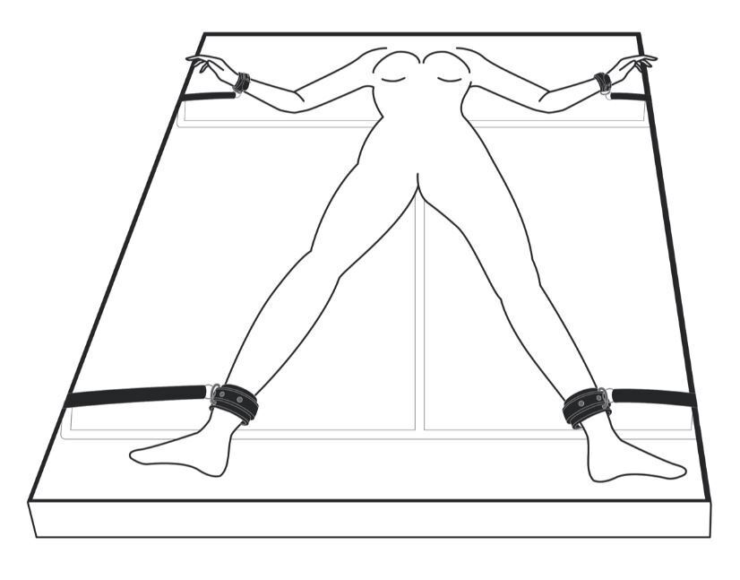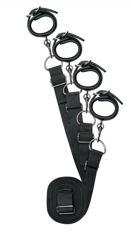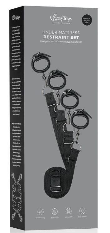 Laadukas sänkysidontasetti tekee vuoteestasi villin bondageleikkikentän. Helposti asennettavat kahleet kiinnitetään patjan tai sängyn alta, todella yksinkertaisesti ja nopeasti. Remmeissä runsaasti säätövaraa, maksimipituus 3,5m. Neljä keinonahkaista,miellyttävästi pehmustettua kahletta. Nilkkakahleiden pituus 13 – 30cm, halkaisija noin 4 – 9,5cm. Käsikahleiden pituus 11 – 28cm ja halkaisija 3,5 – 9cm.