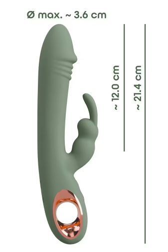 Ihastuttavan ergonominen pupu vibraattori on valmistettu samettisen pehmeästä silikonista, mikä tekee siitä mahdollisimman nautinnollisen käytössä. Se on joustava, mikä tarkoittaa, että se mukautuu täydellisesti vartaloon ja sen liikkeisiin käytö aikana. Hellävarainen varsi ja sen tyylitelty, teksturoitu pää ilahduttavat sisältä tyydyttävällä tavalla ja tarjoavat myös G-pistestimulaatiota. Ihanan kaareva, pupun muotoinen klitorisstimulaattori hyväilee kohdennetusti klitorista pehmeillä korvillaan. Kaksi erillistä moottoria joiden 10 eri värinätoimintoa voit kontrolloida vain napin painalluksella. Kaksi kertaa enemmän stimulaatiota, kaksi kertaa enemmän nautintoa, kaksi kertaa enemmän mukavuutta!