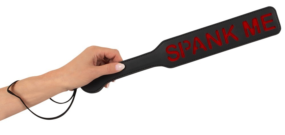 Spank Me-tekstillä varustettu läimäytin. Valmistettu mustasta, kestävästä keinonahasta. Mukavan taipuisa materiaali. Loistava valinta BDSM leikkeihin!