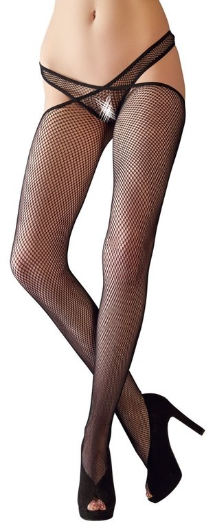 Suurehkoilla rei’illä varustellut näyttävännäköiset verkkosukkahousut. Lantion päälle asettuvat kaistaleet viehättävästi. Haaroväli on jätetty avoimeksi, joten näitä ei tarvitse riisua lainkaan!
