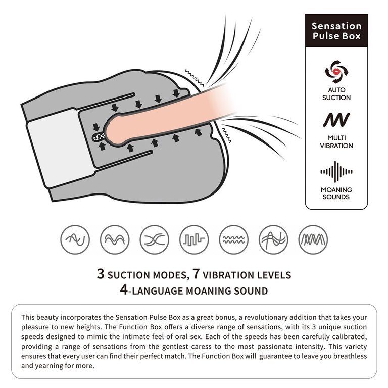 Nautinnollinen handsfree-kokemuksen tarjoava masturbaattori värinä- imu- ja äänitoiminnoilla varustettuna! Vaginan tunneli on nautinnollisesti muotoiltu Tämän masturbaattorin mukana tulevat söpöt tangat, jotka voit vetää sivulle tai riisua kokonaan. Ladattava akku. Muistathan irrottaa moottoriosan puhdistuksen ajaksi! Materiaali pehmeää ja joustavaa keinoihoa (TPE).