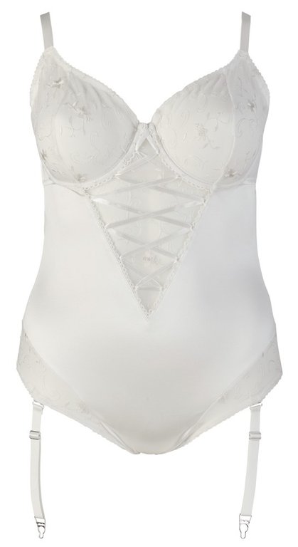 Ihastuttava valkoinen body isommassa koossa. Mukana herkkää ja samalla seksikästä pitsiä. Takana hakaskiinnitys, haarovälissä painonapit, joten vessassakäynti sujuu näppärästi.