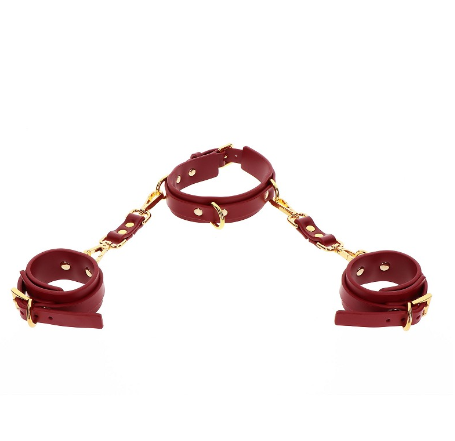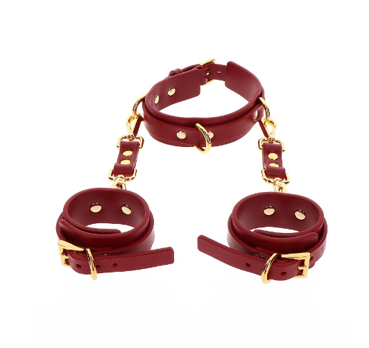 Taboom Luxury D-Ring Collar and Wrist Cuffs on valmistettu kestävästä tekonahasta. Tätä settiä voit käyttää monipuolisesti erilaisilla tavoilla sillä kaulapanta ja kahleet voidaan irroittaa toisistaan. Kahleet kiinnittyvät kätevästi pikalukoilla kaulapantaan ja orjasi on tiukasti hallinnassasi.