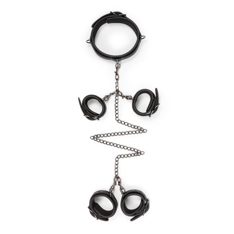 Kaikki mitä täydellisiin bondageleikkeihin tarvitset, samassa kompaktissa paketissa! Tähän täydelliseen bondagesettiin kuuluu kaulapanta, käsikahleet ja jalkakahleet, jotka ovat toisissaan kiinni yhdellä ketjulla.