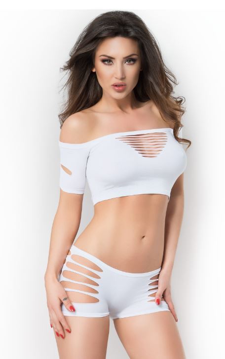 Seksikäs valkoinen toppi ja yhteensopivat microshortsit. Sivuilta revityt yksityiskohdat tuovat annoksen seksikkyyttä. Joustava materiaali on miellyttävä päällä.