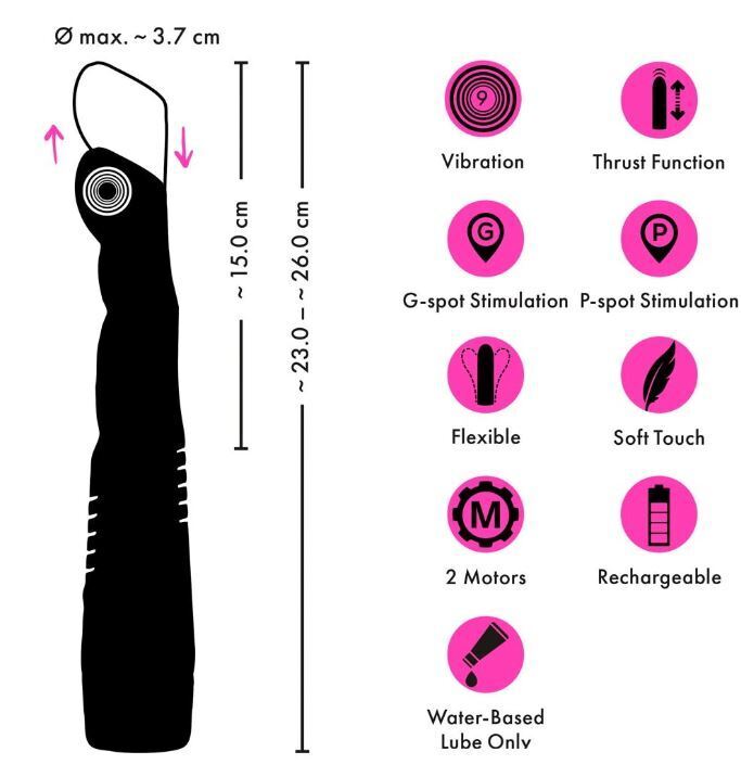 Vibraattori, joka värisee ja työntyy saavuttaaksesi kliimaksin! Tämä on täysin uuden luokan vibraattori. Siinä on yhdeksän värinäohjelmaa ja yhdeksän työntöohjelmaa. Voimakkaat värinät yhdistettynä työntöliikkeeseen antavat ennennäkemätöntä nautintoa. Kaikkea tätä voit helposti ohjata lelussa olevista napeista. Vibraattorin pohjassa on irroitettava imukuppi, jonka saa kiinni mihin tahansa tasaiselle pinnalle. Materiaalina toimii samettisen pehmeä silikoni.