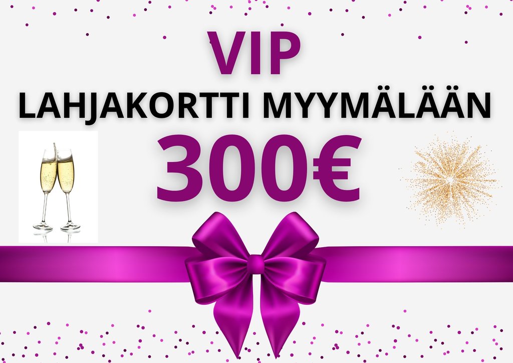 Haluatko saada VIP-kohtelua myymälässämme? Osta tästä lahjakortti ja sovi myymälän henkilökunnan kanssa vaikka sähköpostitse milloin haluat tulla palveltavaksemme! Voit ottaa ystäväsi mukaan myös. Tarjoamme teille henkilökohtaista palvelua joko myymälämme aukioloaikojen puitteissa, tai sen ulkopuolella. Tarjoamme teille kuohuvaa, sekä pientä purtavaa samalla. Voimme yhdessä sopia toiveistanne esittelyn suhteen ja saatte ostaa lahjakortin summalla mieluisianne tuotteita.